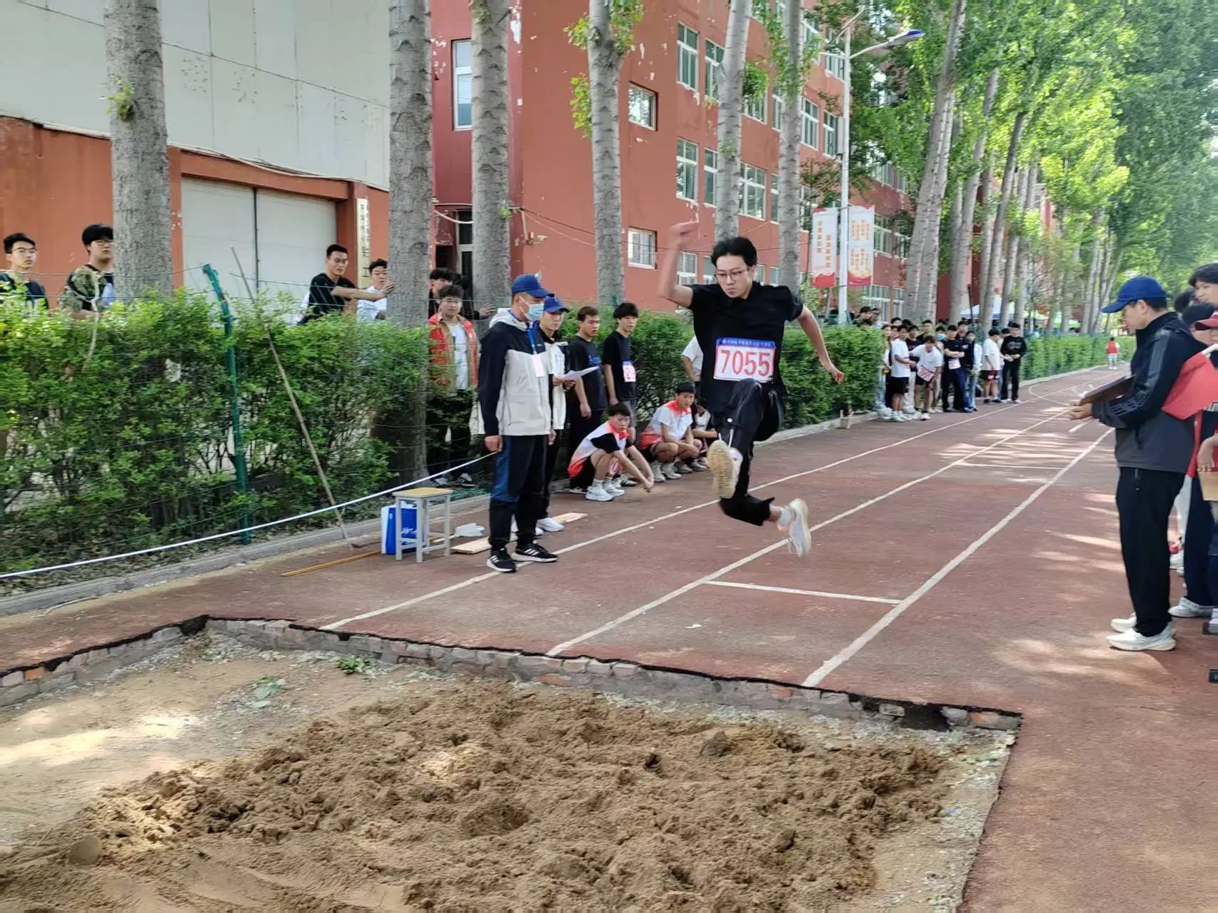 跳遠(yuǎn)場上運(yùn)動健兒們化身騰空飛燕。擺臂、蹬地、起跳!剎那間身體一躍而起,落地瞬間沙粒飛濺,我們在空中劃出了條條優(yōu)美的拋物線。丈量的卷尺越來越遠(yuǎn),我們的勁頭越來越足!