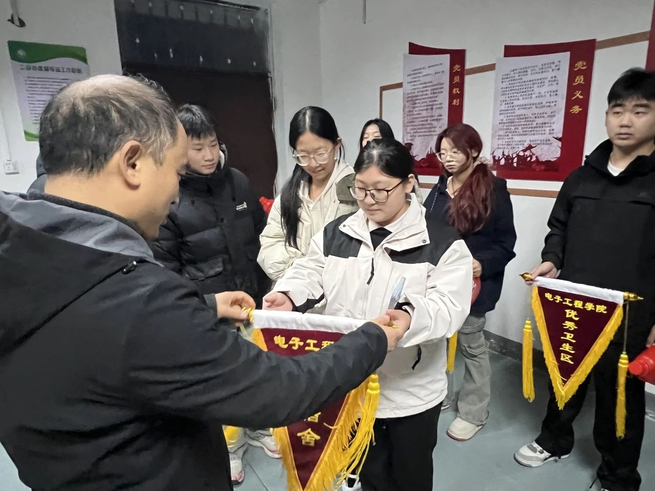 為不斷進(jìn)一步增強(qiáng)電子工程學(xué)院學(xué)子們的衛(wèi)生意識(shí)和文明素養(yǎng),展現(xiàn)良好的校園形象,電子工程學(xué)院于2024年11月25日開(kāi)展了“流動(dòng)紅旗”評(píng)比活動(dòng)。其中黨總支書(shū)記王正偉、學(xué)生支部書(shū)記李玲玲對(duì)上周優(yōu)秀宿舍頒發(fā)流動(dòng)紅旗,各班級(jí)班長(zhǎng)、團(tuán)支書(shū)、學(xué)院生活部參與本次頒發(fā)儀式