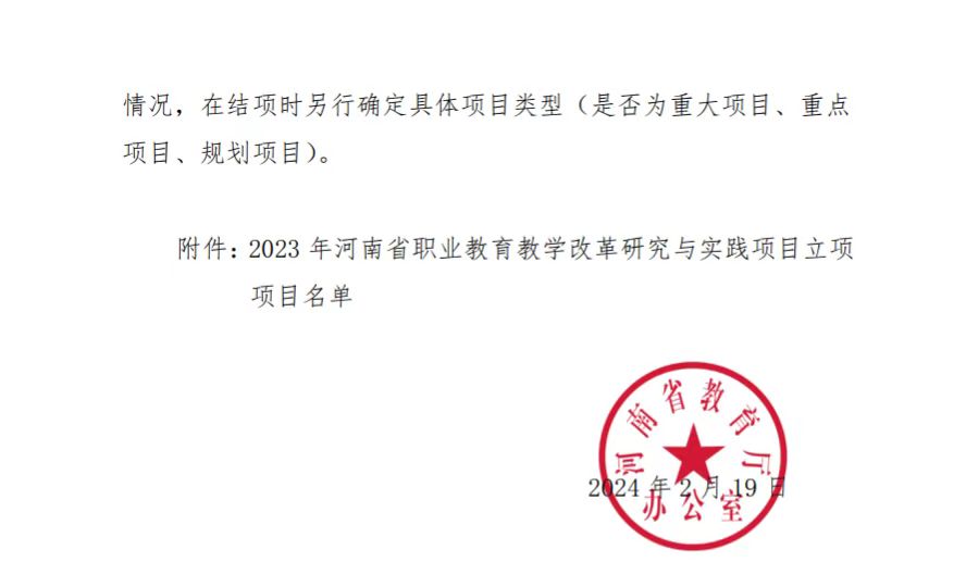 據(jù)《河南省教育廳辦公室關(guān)于開展 2023 年河南省職業(yè)教育教學(xué)改革研究與實(shí)踐項(xiàng)目立項(xiàng)工作的通知》(教辦職成〔2023〕472號(hào)):
