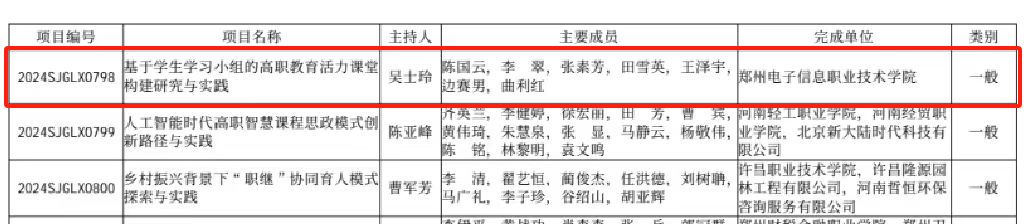 我院黨總支書記吳士玲同志主持的項目“基于學生學習小組的高職教育活力課堂構(gòu)建研究與實踐”獲得2024 年度河南省高等教育教學改革研究與實踐項目立項。
